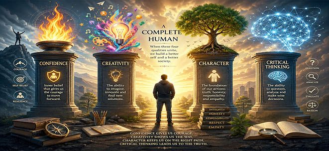 انساني زندگي صرف وقت گذارڻ يا روزمره جي ضرورتن کي پورو ڪرڻ جو نالو ناهي، پر اهو هڪ شعوري، فڪري ۽ اخلاقي سفر آهي. هن سفر ۾ انسان آهستي آهستي پاڻ کي سڃاڻي ٿو، پنهنجي ڪمزورين کي سمجهي ٿو ۽ اهڙيون خوبيون پيدا ڪري ٿو جيڪي کيس نه رڳو ڪامياب بڻائين ٿيون، پر باوقار، بااخلاق ۽ ذميوار به بڻائين ٿيون. هڪ مڪمل انسان جي تعمير لاءِ چار بنيادي ستون آهن: اعتماد، تخليق، ڪردار ۽ تنقيدي سوچ. جيڪڏهن اهي سڀ خوبيون متوازن نموني سان ڪنهن فرد ۾ موجود هجن ته اهو نه صرف پنهنجي زندگي ۾ سڪون ۽ مقصد حاصل ڪري سگهي ٿو، پر سماج جي بهتري لاءِ به اهم ڪردار ادا ڪري سگهي ٿو. اعتماد انسان جي اندر لڪل اها طاقت آهي، جيڪا کيس مشڪلاتن جي باوجود اڳتي وڌڻ جي همت ڏئي ٿي. اهو شور ڪندڙ يا ڏيکاءُ وارو جذبو ناهي، پر هڪ خاموش يقين آهي جيڪو انسان کي پنهنجا فيصلا ڪرڻ، پنهنجن اصولن تي قائم رهڻ ۽ ٻين جي راءِ کان متاثر ٿيڻ بدران پاڻ تي ڀروسو ڪرڻ سيکاري ٿو. هڪ بااعتماد انسان کي خبر هوندي آهي ته هو مڪمل ناهي، پر سکڻ ۽ بهتر ٿيڻ جي صلاحيت رکي ٿو. جڏهن هو ڪا غلطي ڪري ٿو ته ان کي لڪائڻ بدران قبول ڪري ٿو ۽ ان مان سبق حاصل ڪري ٿو. اهڙو رويو انسان کي اندروني طور مضبوط بڻائي ٿو. اعتماد انسان کي ٻين جي منظوري تي دارومدار رکڻ کان آزاد ڪري ٿو، جنهن سان هو پنهنجي اصل سڃاڻپ برقرار رکي ٿو، پر اعتماد هڪ ڏينهن ۾ پيدا نٿو ٿئي. اهو تجربن، ناڪامين ۽ مسلسل ڪوششن سان آهستي آهستي وڌي ٿو. جڏهن انسان پنهنجي خوفن کي منهن ڏئي ٿو ۽ نوان قدم کڻي ٿو، تڏهن سندس اعتماد مضبوط ٿيندو آهي.