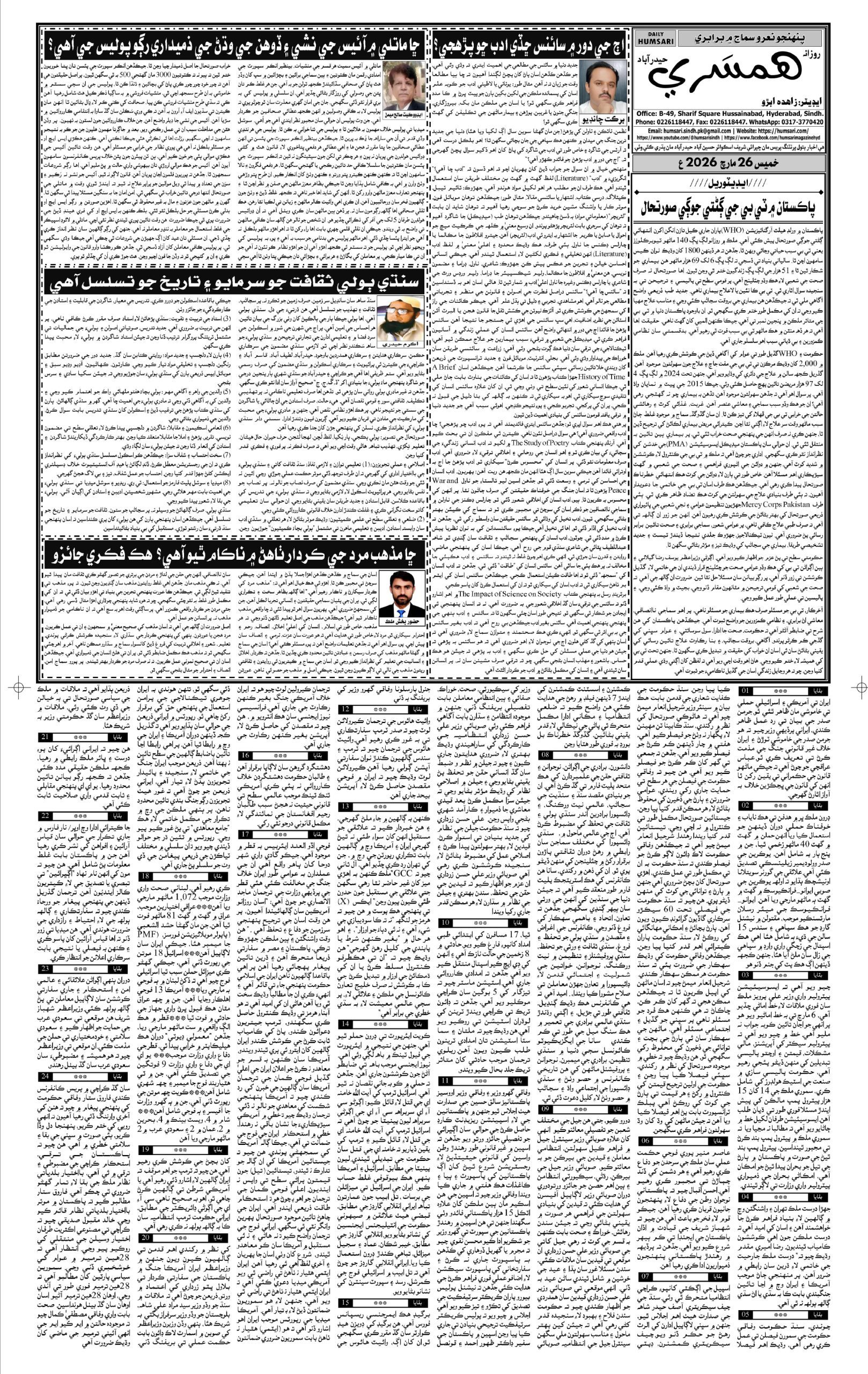 Monthly Humsari is the leading Sindhi Magazine that is read generally in Sindh, all over Pakistan and particularly worldwide.