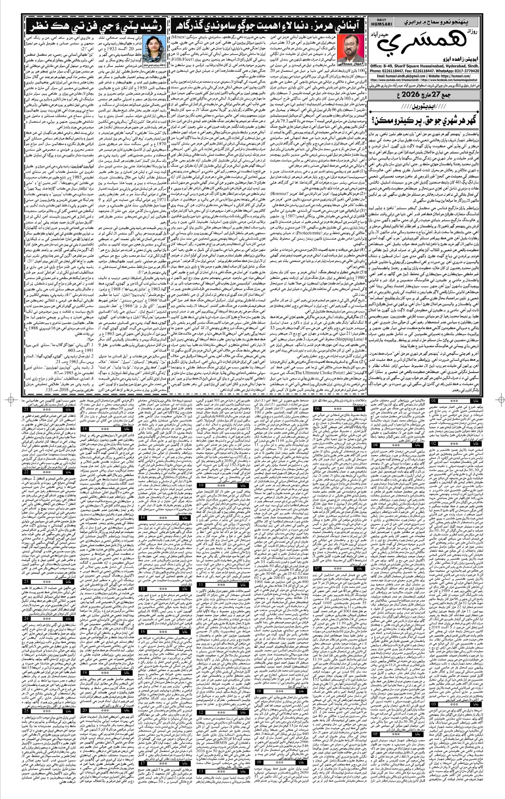Monthly Humsari is the leading Sindhi Magazine that is read generally in Sindh, all over Pakistan and particularly worldwide.