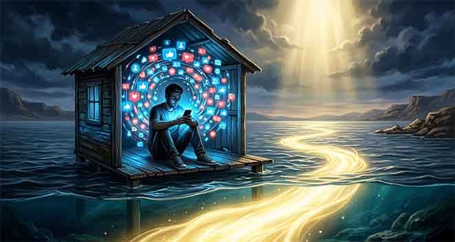 اڄ جو انسان به انهيءَ مورک وانگر آهي، جيڪو پاڻيءَ جي مٿان جهوپڙو ٺاهي ويٺو هجي، پر اُڃ ۾ تڙپي مري وڃي. الله جي هدايت موجود، دين جي دولت موجود، قرآن جي روشني موجود؛ پر انسان سوشل ميڊيا جي سرور، شهرت جي شوخي ۽ شهوت جي شوق ۾ اهڙو گم آهي جو روحاني سڪون کان محروم آهي. هو وڊيوز جي ورقن ۾ وڪوڙيل، ويرل ٿيڻ جي ولولي ۾ ويڙهيل ۽ وقت جي وهڪري ۾ وڃايل نظر اچي ٿو.